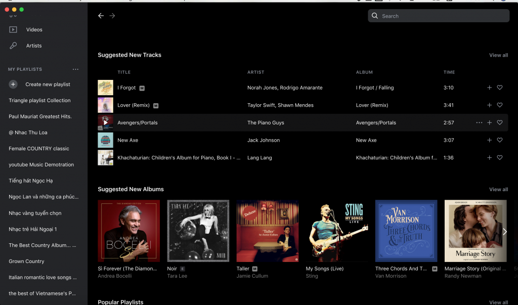 Nếu như tính năng đầu tiên thường được các dịch vụ stream nhạc (mà điển hình là Apple Music) đưa ra là cho phép người dùng chọn thể loại nhạc ưa thích thì Tidal lại đi theo hướng ngược lại hoàn toàn. Tidal sẽ giới thiệu các album, clip đang “hot”. Tidal vẫn hỗ trợ tính năng tìm kiếm khá tốt. Trên phần lớn các cửa sổ, bạn có thể sử dụng ô tìm kiếm ở bên phải màn hình. Các kết quả sẽ được trả về ngay trong cửa sổ tìm kiếm nhỏ, cho phép bạn không cần rời khỏi màn hình hiện tại.